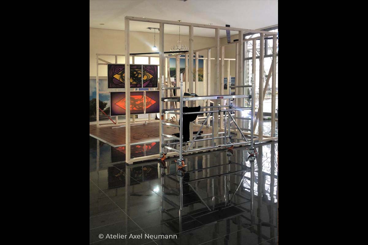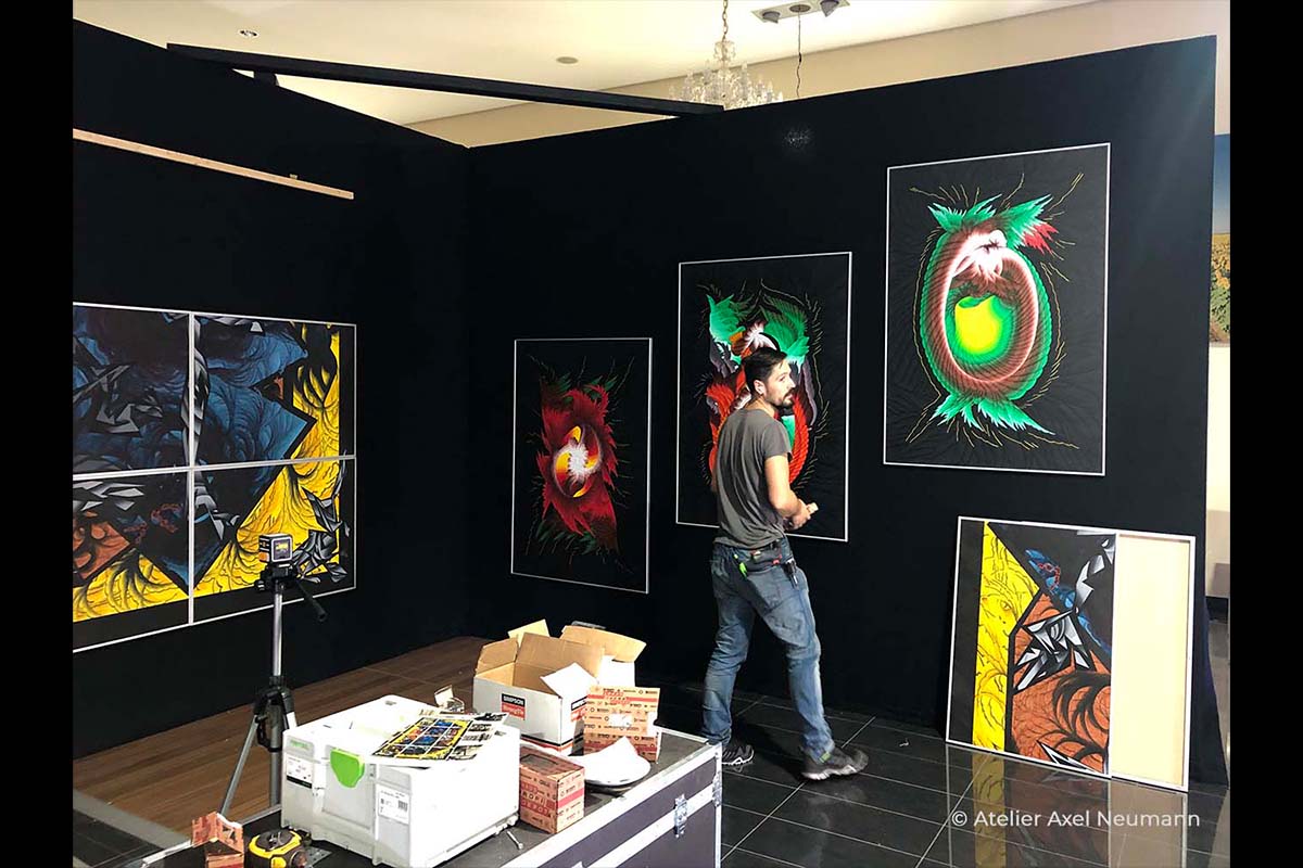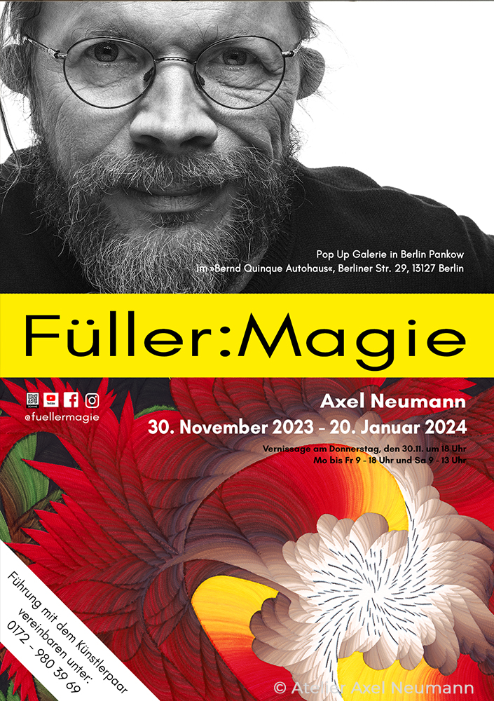 „Füller:Magie“ war eine Pop-Up-Galerieausstellung mit riesigem Schaufenster. Der spiegelglatte Fließenboden hat die Kunstwerke verdoppelt. Diese Reflexion machte die Ästhetik der Symmetrie zum zentralen Thema der Ausstellung.