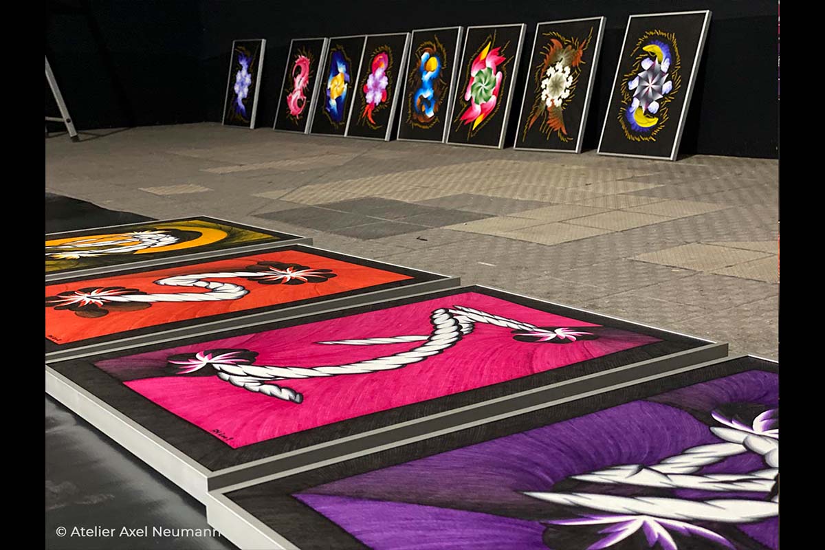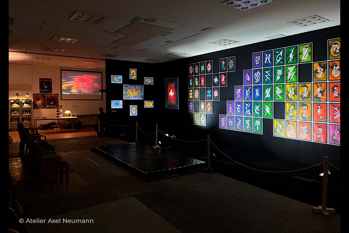 Axel Neumann ließ die Zwischenwand der letzten beiden ZWISCHENWELTEN Ausstellungen entfernen, um den Raum komplett zu öffnen. Es entstand eine 17 Meter lange Hauptwand. Ein strenges geometrisches Ordnungsprinzip brachte die überbordende Lebendigkeit und Vielfalt der Motive in eine klare, emotional greifbare Struktur.