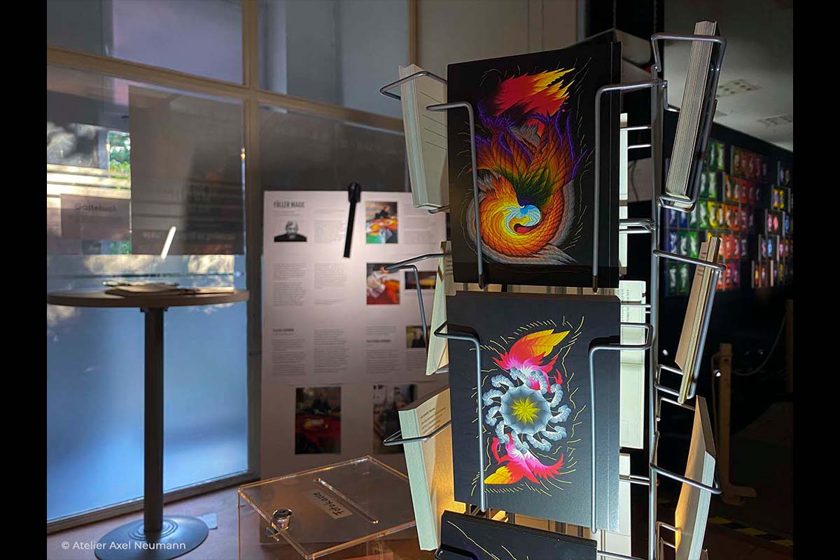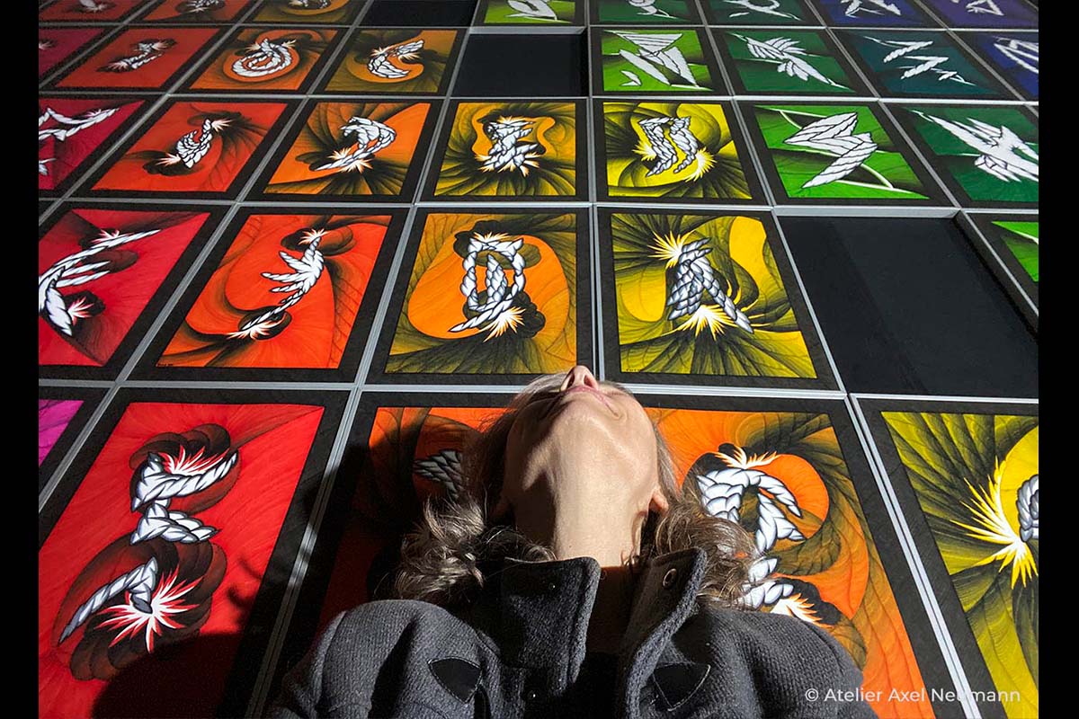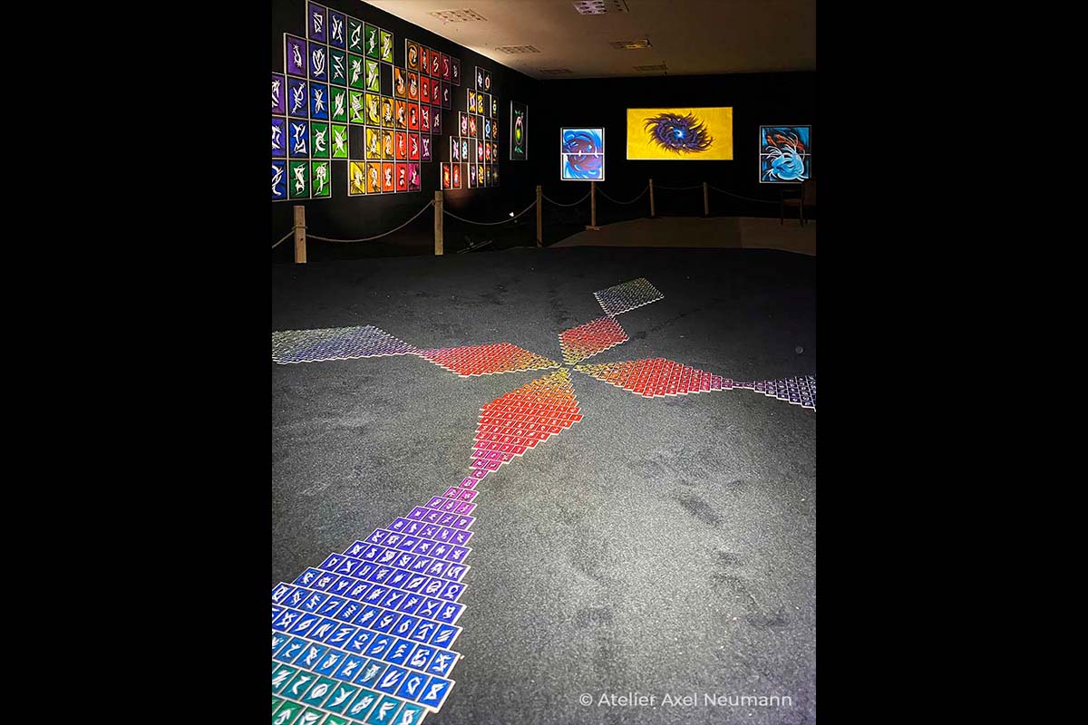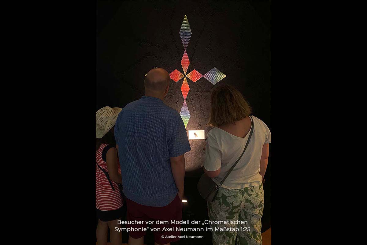 Diese Ausstellung widmeten wir unserer Chromatischen Symphonie. Es war das erste Mal, dass wir Auszüge daraus öffentlich vorgestellt haben. Da das Original Kunstwerk mit seinen 900 Tafeln und 40 Metern Höhe den Raum gesprengt hätte, mussten wir uns damit begnügen, 51 Elemente daraus zu zeigen – ergänzt durch ein Modell des Gemäldes im Maßstab 1:50, um das Gesamtkonzept erfahrbar zu machen.