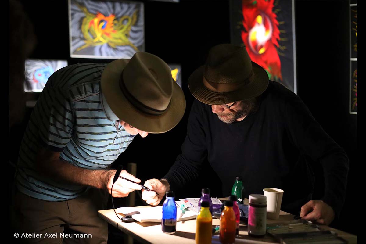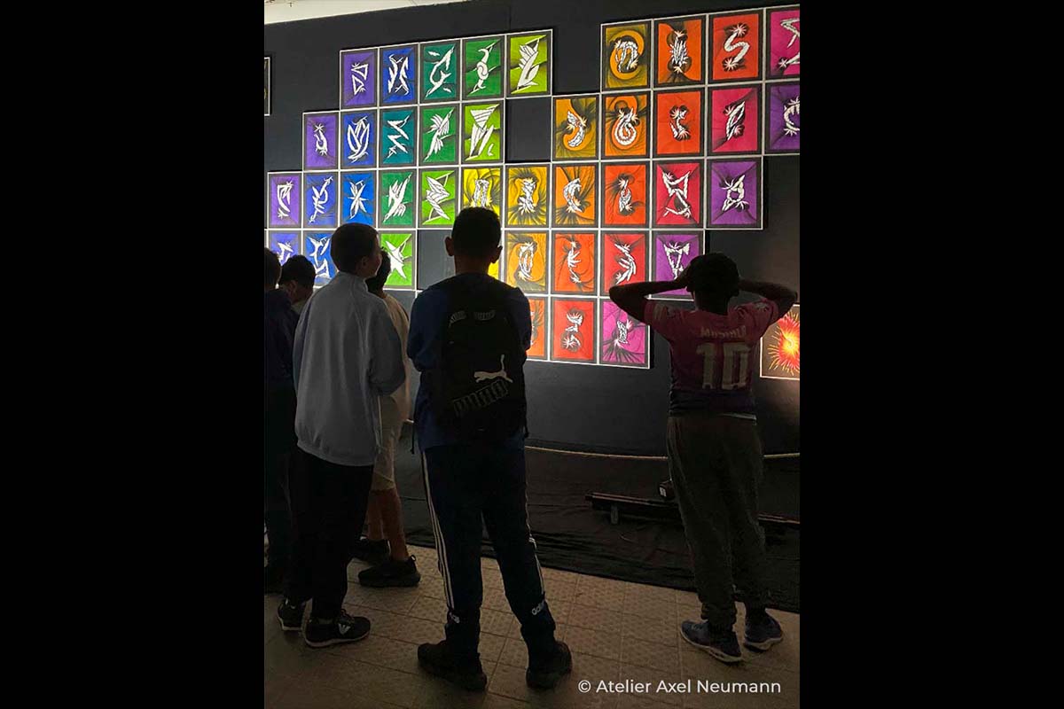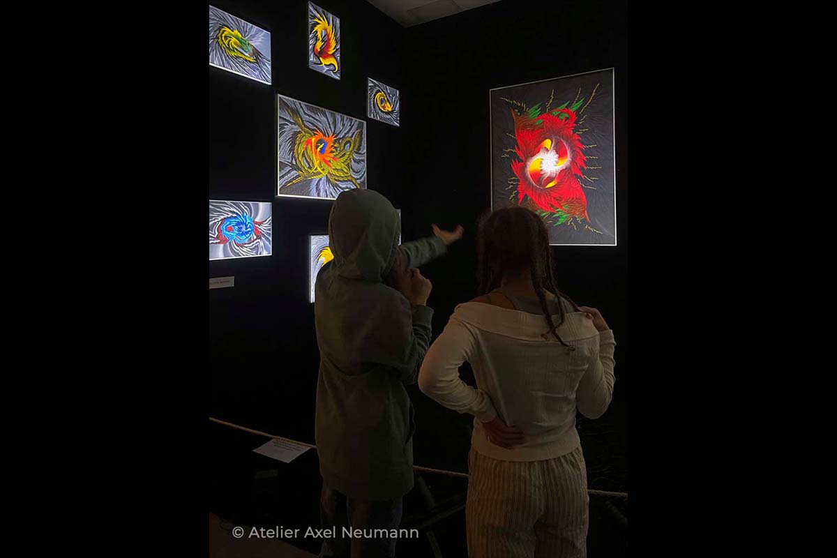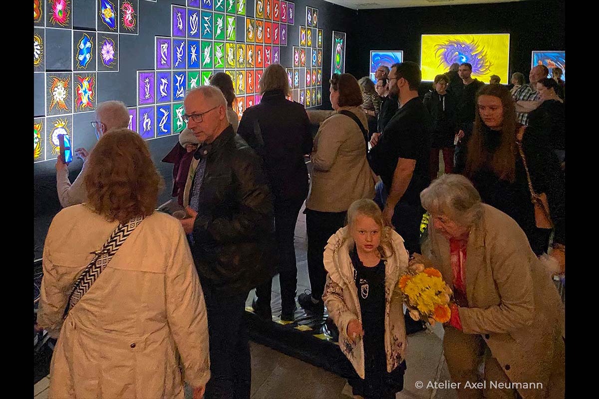 Mein ganz persönliches Highlight dieser Ausstellung war der Besuch des gehörlosen Jugendclubs „Sinneswandel“, der eine Dolmetscherin für Gebärdensprache mitbrachte, die meine Ausführungen simultan übersetzte. Der brennend klare Fokus der Kinder ging mir durch Mark und Bein! Wie in einer synchron einstudierten Choreographie wanderten ihre Blicke zwischen den Händen der Dolmetscherin und den Kunstwerken hin und her. Natürlich formten die Kinder ihre Rückfragen ebenfalls mit Gebärden und so füllte sich der Raum mit immer mehr Zeichen und Symbolen. Und da war er wieder: Der verblüffende Praxisbezug von Axel Neumanns Kunst.