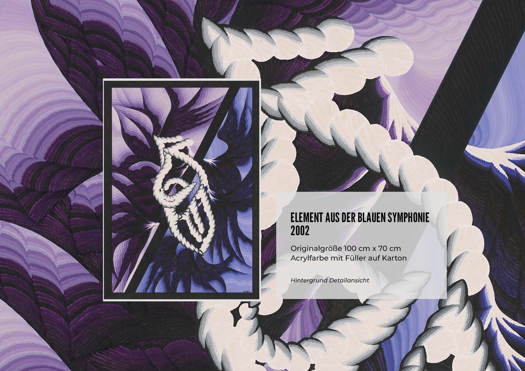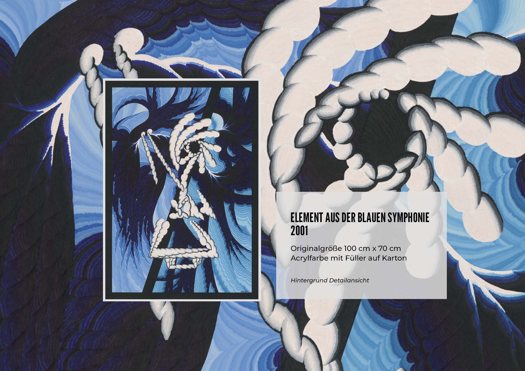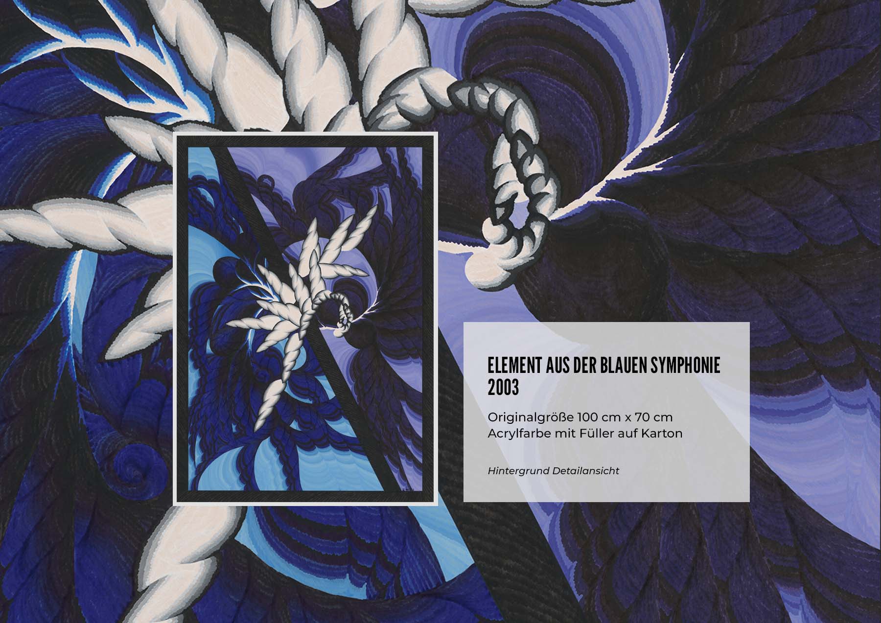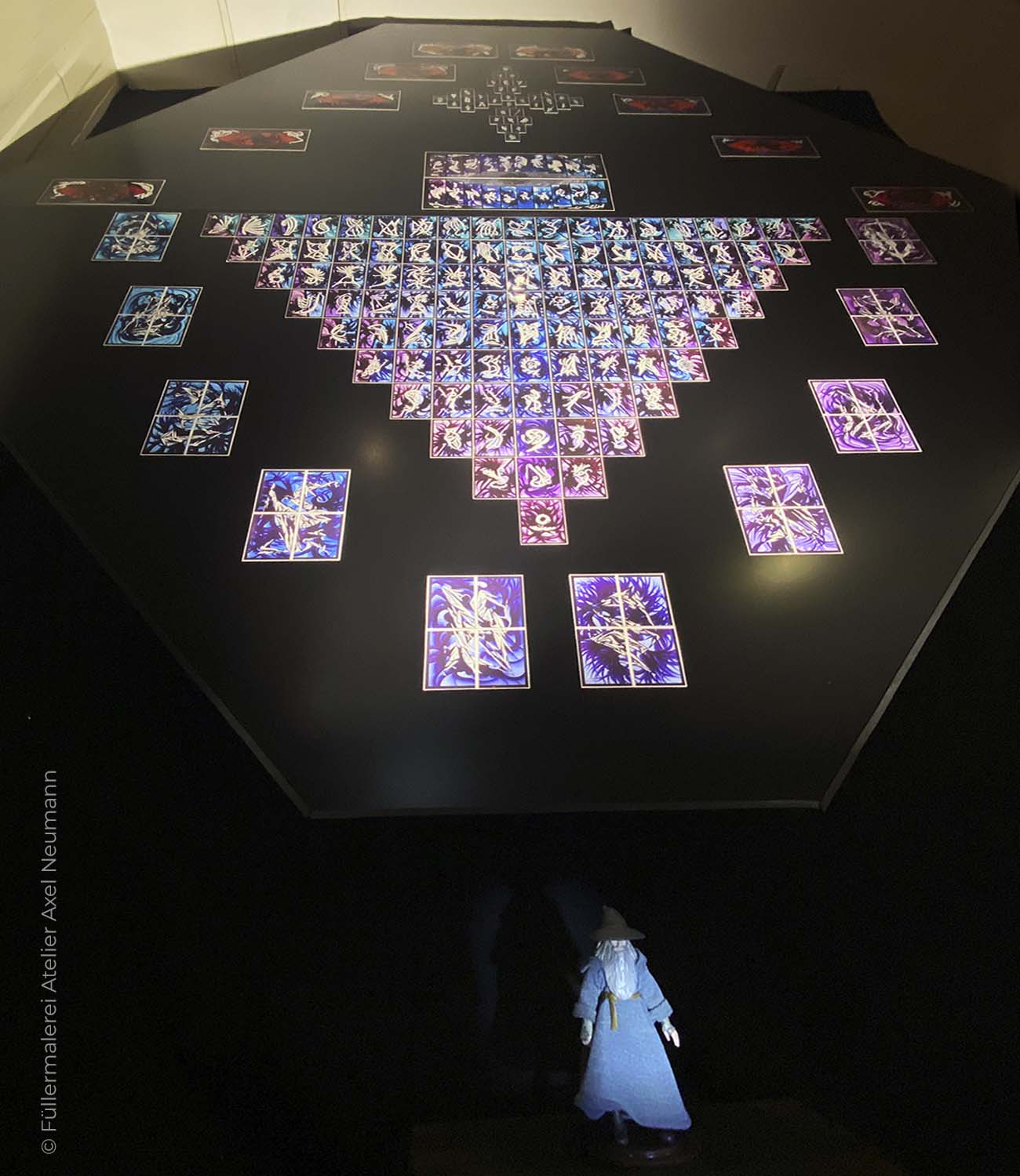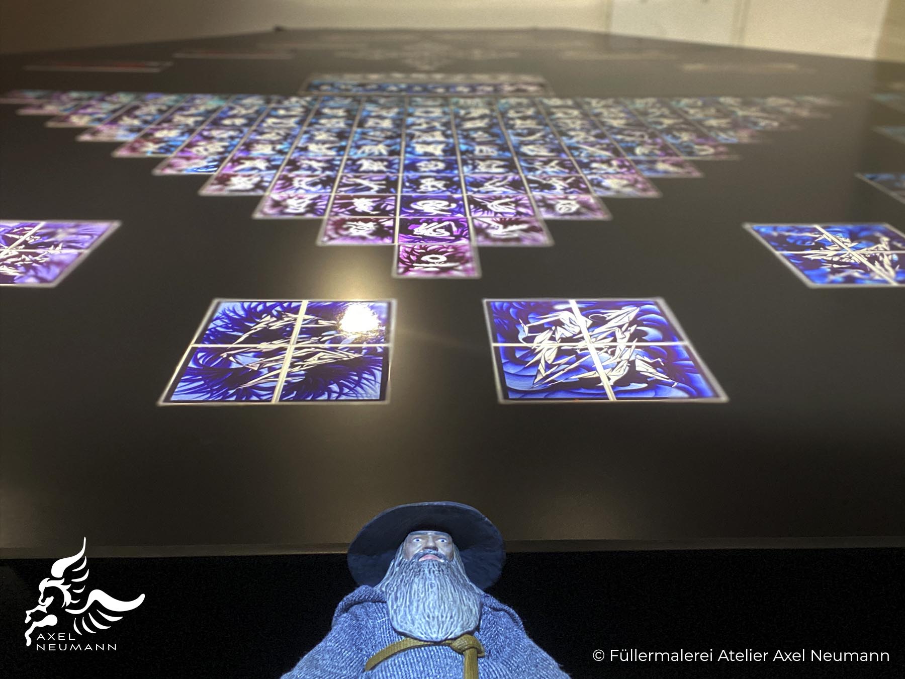 Ich will und kann Ihnen nicht beschreiben, was auf diesem Kunstwerk zu sehen ist. Nur soviel: Die Vielfalt der abgebildeten Formen und Symbole auf der gigantischen Fläche ist bemerkenswert: jedes Detail ist einzigartig und wiederholt sich nicht. Der streng mathematische Aufbau basiert auf 10 unterschiedlichen Blautönen. Blau ist weltweit die beliebteste Farbe – intutiv verbunden mit Themen wie Wasser, Tiefe und dem Unbewussten. Es passt wunderbar in den reichen Deutungsschatz der aufsteigenden Geheimnisse der Dunkelheitserfahrung.