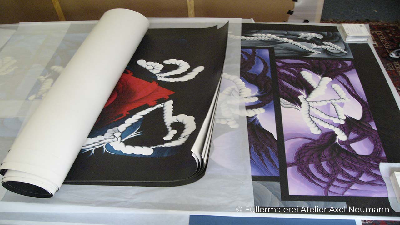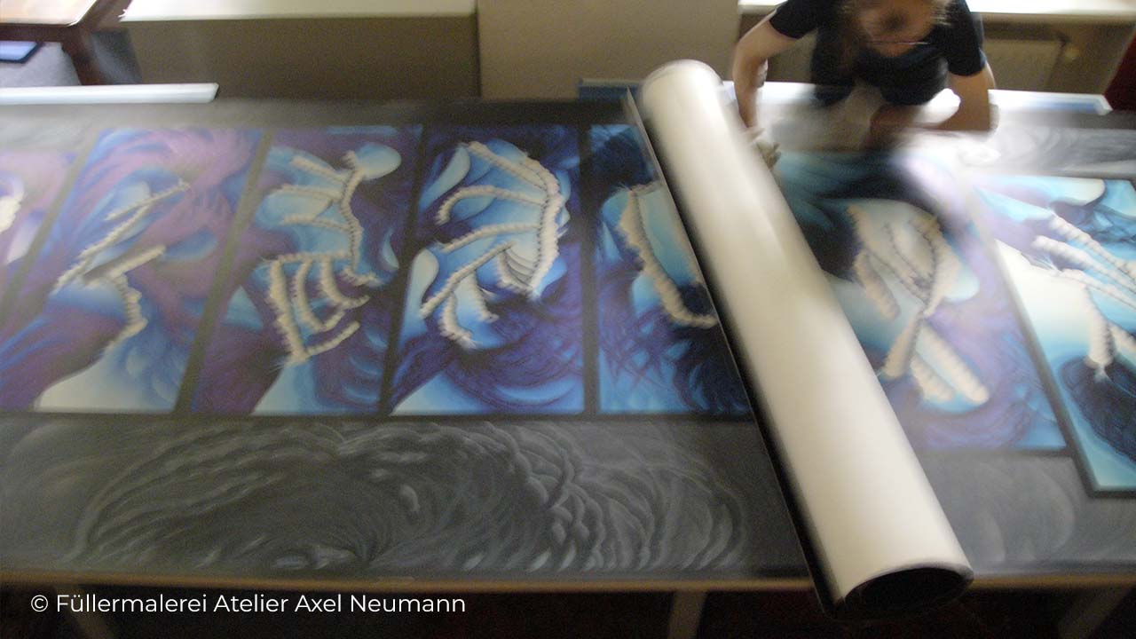 Die 158 Tafeln der „Blauen Symphonie“ haben unterschiedliche Formate. Das Größe davon ist das „Krönungsbild“. Mit einem Format von 3 x 4,5 Metern war es für die Logistik im Atelier eine echte Herausforderung! Füllergemälde können nur auf dem Tisch gemalt werden, da der Füller nach unten gerichtet sein muss, damit die Farbe fließt. Da weder unser Atelier noch der Maltisch groß genug sind, um das riesige Papier auf einmal zu bemalen, mussten wir eine Lösung finden. Axel nutzte eine Metallrolle: Er rollte das Papier jeweils so weit auf, dass immer nur der Abschnitt, der gerade bearbeitet werden sollte, flach auf dem Tisch lag.