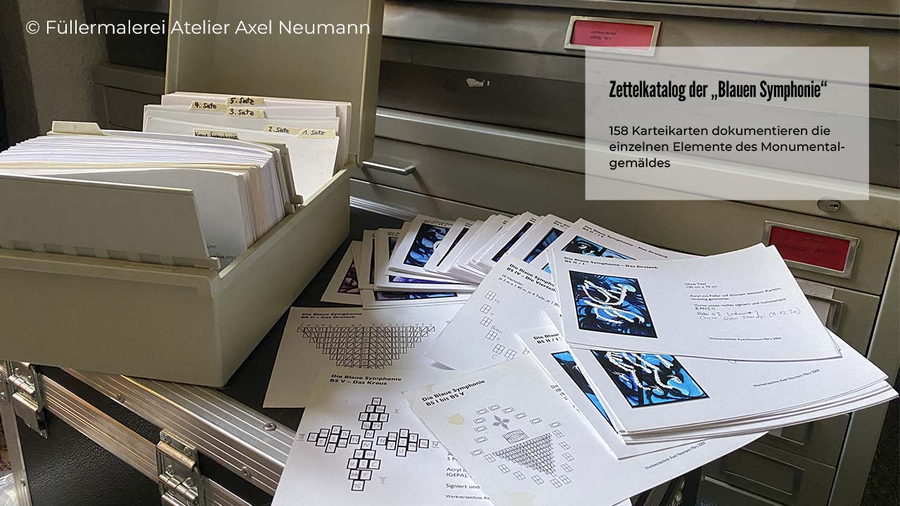 Das Kunstwerk die „Blaue Symphonie“ ist Axel Neumanns erstes Monumentalgemälde. Es ist 23 Meter hoch und seine Erschaffung hat 7 Jahre gedauert. Für die meisten von uns ist seine Größe schwer vorstellbar. 23 Meter, das ist in etwa so hoch wie ein 7 bis 8-stöckiges Hochhaus. Auch große Konzertarenen erreichen solche Höhen und mehr, aber Hand aufs Herz: Es gibt nicht viele Räume auf der Welt, in denen ein so riesiges Gemälde ausgestellt werden kann. Immer wieder unterbreiten uns Besucher den Vorschlag, es doch outdoor zu zeigen. Aber aufgrund des empfindlichen Materials – das Gemälde besteht aus Papier – ist eine Outdoor-Präsentation leider nicht realisierbar.